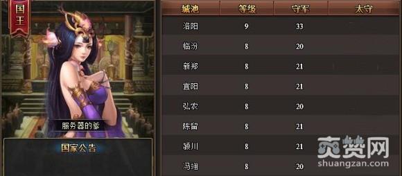 成为国王享有无上的荣耀,在自己的势力范围内还可以主宰生杀大权。游戏王国《百将天下》国王除了能够领取到最给力的俸禄之外,在自己的领地之中,可以对我方阵营战力排名前20的主公成为我方的城池太守,并且将太守的兵马纳入自己的禁卫军麾下,根据自己意愿决定太守的任期,通过巩固势力城防抵御敌人的来犯。