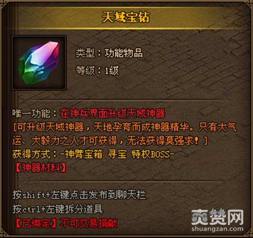 神兵成长需要的物品,也不是平淡之物,而是需要传说中的天地孕育的神器精华天域宝钻,此物需有大气运,大毅力之人方可获得!当锻造到神兵之上,神兵便会泛起耀眼的光芒,天空七彩祥云涌动;天域神钻获得方式也并不是单一的,可以通过神臂宝箱、特权BOSS、寻宝等方式获得哦~