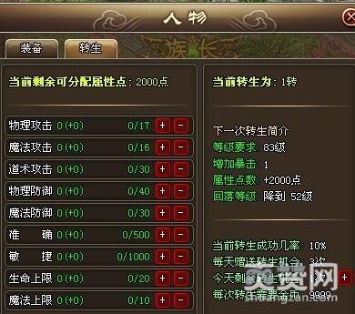 当大家级别提升到一定等级时,可以进行转生。虽然等级会有所下降,但实力却可以得到进一步的提升。而且每次转生成功之后,大家还可以获得一定属性点,合理分配这些属性点,实力将会有质的提升哦!