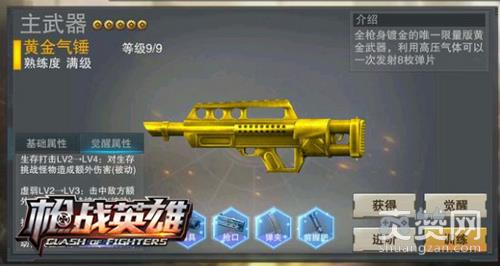 人靠衣装,当武器披上黄金战甲,战力加成更加逆天!【黄金气锤】将是你称霸夺宝模式的最佳选择,专属战斗技能【虚弱】,可以击中敌方时附带超强力的减速效果,同时它还能一次性发射8枚弹片,足以打出高强度的火力压制,让你轻松击退任何想要夺取宝藏的敌人!