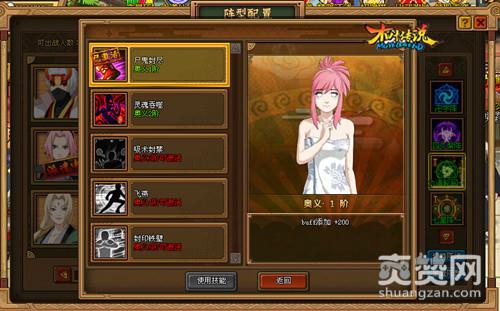 点击阵型配置中的“奥义技能”按钮能打开技能选择界面,在已经学会的不同技能中玩家可以自由切换,该加成效果将对所有当前上阵忍者生效。目前可激活的奥义技能共分五阶,后续还将逐渐增加新的技能,随着品阶的提升,提供忍者们更为强大的属性加成。