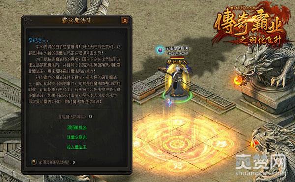 37《传奇霸业》中,凡等级达到100级的玩家,即可开启霸业魔法阵。游戏中击杀野外BOSS后有几率获得魔法玉。捐献魔法玉可提升魔法阵等级,每捐献1个魔法玉,即可提升魔法阵1级。