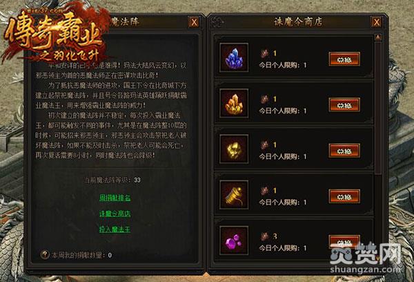 另外,玩家每次捐献魔法玉,均有几率获得诛魔令,可前往诛魔令商店兑换珍贵的道具,其中部分道具有每天个人限购次数和每周全服限购次数限制。