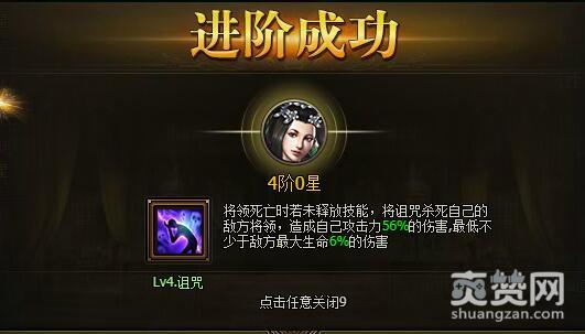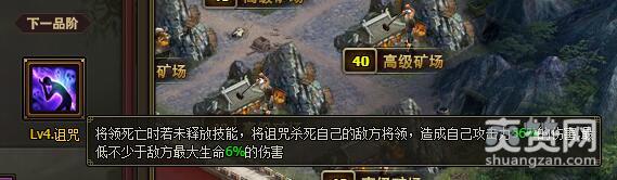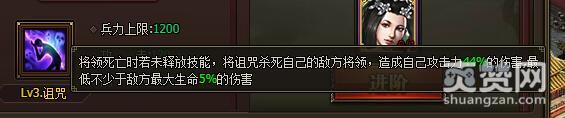 3级诅咒升4级诅咒时,3级诅咒规定:将领死亡时若未释放技能,将诅咒杀死自己的敌方将领,造成自己攻击力56%(与3级相比增加12%)的伤害,最低不少于敌方最大生命6%(与3级相比增加1%)的伤害。