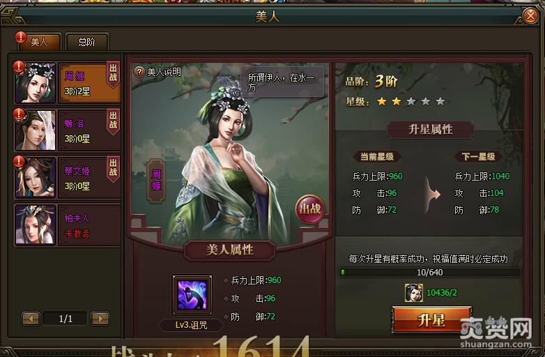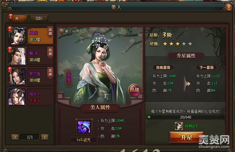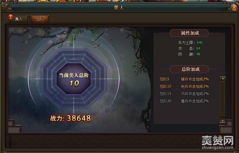 第一步:你需要激活三位美人。获得100个碎片合成1个美人,就能成功激活。激活三位美人后,你的当前美人总阶会固定为3阶。之前我们已经将美人总阶提升到9阶了,所以这里战力提升25751。属性加成——兵力上限:640,攻击:64,防御:48。