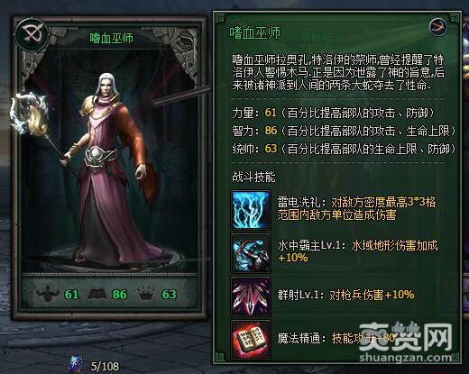 嗜血巫师的雷电洗礼威力比较弱,只能打一块区域的杂兵。水中霸主技能可以让他在水域地形下发挥较强的威力。作为弓兵,它还有群射技能,对敌方枪兵造成一定的伤害。而魔法精通则是更进一步提升嗜血巫师的技能威力。总体上来说,它的智力比较高,在前期缺武将的情况下可以暂时担任后排弓兵一角。