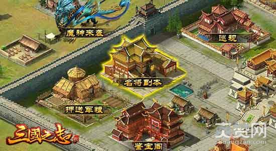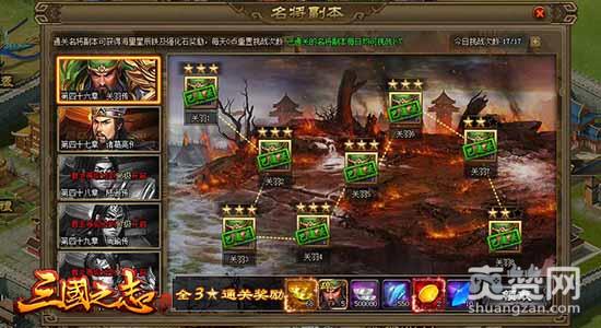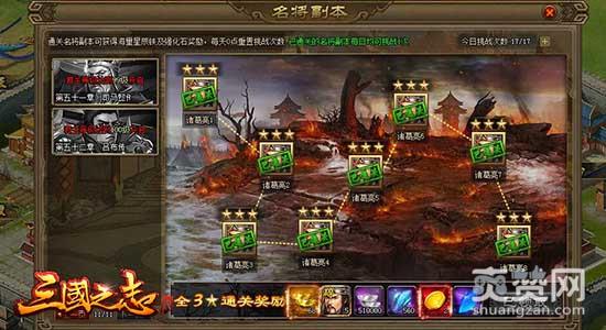 名将副本中根据武将的不同共分为52章,每一章中有八个副本,挑战副本成功有大概率获得1到2个对应武将碎片,八个副本全部三星通关后,可获得一次通关奖励,内容包括5个对应武将碎片、元宝、奖励金等道具。