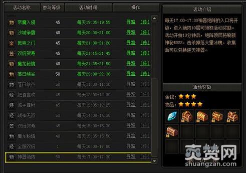 923yx《战天》中的神器绝阵活动在每天的17:00-17:30开启,神器绝阵中共分为11层,每层有四个入口,但是只有一个入口可以进入下一层。如果进入了另外三个入口,大家就会回到上一层,这时就需要重新找到正确的入口,才能进入下一层。