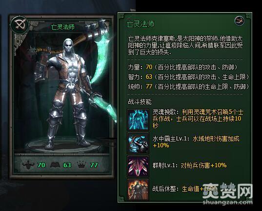 亡灵法师的咒术可以复活战士10秒。可别小看这10秒时间,一场战斗打的快的话也就20秒左右。在竞技场中,当战力相差无几的情况下,多出5个战士可以让你更有获胜的希望。同时亡灵法师还具有水域地形伤害加成效果。作为弓兵打枪兵有奇效,生命值也比其他绿将多。