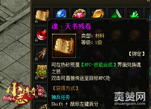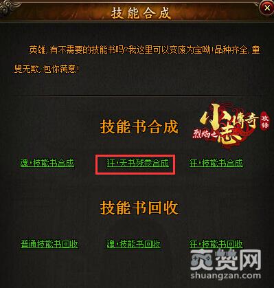 在游戏中,玩家需要收集对应的天书残卷、狂暴精华等材料来合成获得技能书。这些技能的合成操作,需要到9377小志传奇热砂荒漠城里找NPC“技能合成”去合成。
