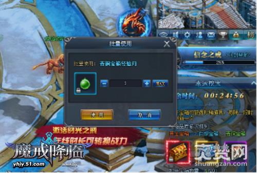 开个青铜宝箱,获得青铜宝箱经验丹,这样经验值又小小的提升了一下。想不想知道黄金宝箱里是什么?魔魂、40万金币、两倍经验药水、坐骑丹、攻速卷轴、攻击卷轴、大型经验丹等,还有个大惊喜,自己找找看?通常这些宝箱都是供不应求的,所以一定要快哦!