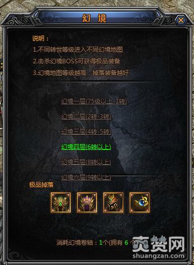 1、等级限制:幻境一层(75级-1转)、幻境二层(2转-3转)、幻境三层(4转-5转)、幻境四层(6转以上)、幻境五层(8转以上)。