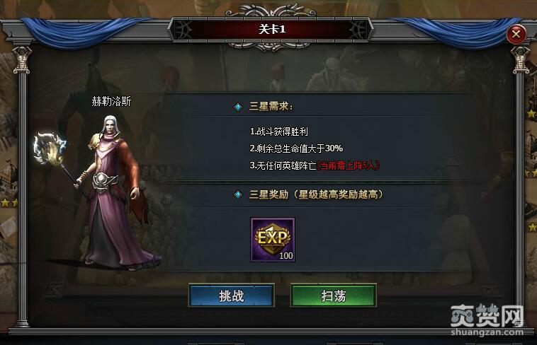 关卡1,对战赫勒洛斯。三星奖励,经验值100点。