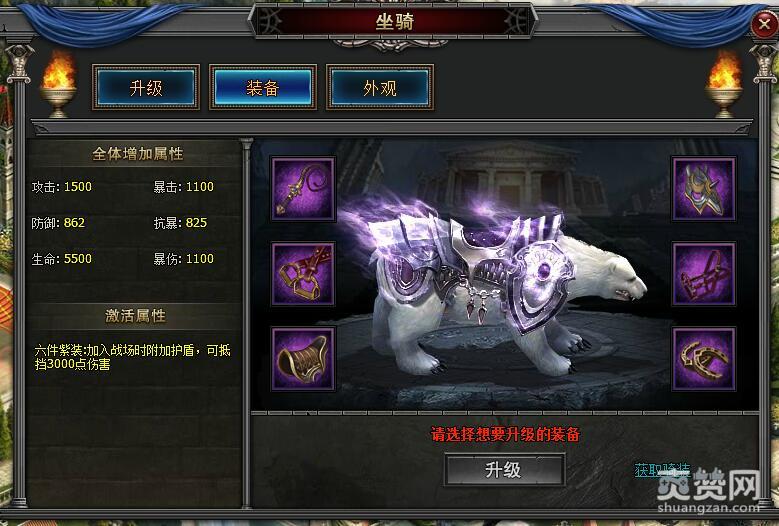 六件紫装:加入战场时附加护盾,可抵挡3000点伤害。