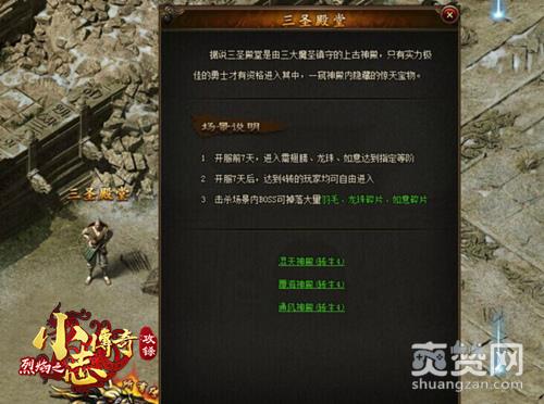 据说9377小志传奇三圣殿堂是由三大魔圣镇守的上古神殿,只有实力极佳的勇士才有资格进入其中,一窥殿内隐藏的惊天宝物。所以,在游戏中,玩家要进入三圣殿堂,必须满足一定等级后,才允许进入的。玩家所在的区域为开服前7天,就需要翅膀、龙珠、如意达到指定等级后,才能够进入三圣殿堂。