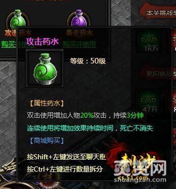 首先要为玩家朋友介绍的是攻击药水。双击使用增加人物20%攻击,持续3分钟。连续使用将增加效果持续时间,死亡不消失。
