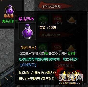 其次要为玩家朋友介绍的是暴击药水。双击使用增加人物8%暴击率,持续3分钟。连续使用将增加效果持续时间,死亡不消失。