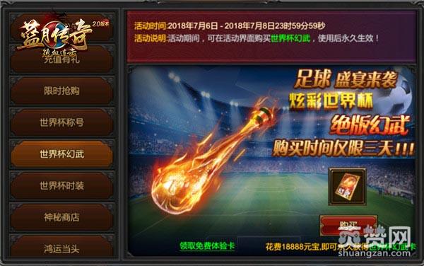 贪玩《热血连击》迷情世界杯活动除了为玩家准备了绝版世界杯称号之外,还准备了绝版玄武,仅限三天,限时抢购世界杯幻武,使用后永久生效,更有免费体验卡领取,你还在等什么,快来享受足球盛宴吧!