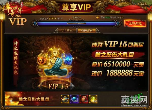 为了给传世大哥庆生,从7月7日起,传奇世界网页版进行了一轮更新,赶紧一睹为快吧! 新增了VIP福利礼包功能,玩家可点击vip标识进入vip界面购买对应等级的vip福利礼包,超值优惠,超值礼包,不容错过!原价651万的礼包现价只要不到200万了!掐指一算,白送400万的节奏啊!