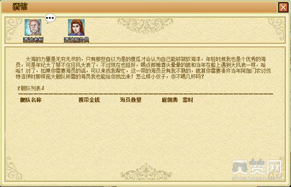如果你暂时没有属于自己舰队成员,那你可以到酒馆里找老板帮你找几个海员,临时雇佣他们。这里的老板特别热衷于此事,因为他年轻时也是一名优秀的海员(虽然不知道这话里的真假),他会很热心的帮助你的舰队募集海员。