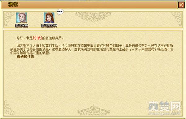 虽然酒馆这里没有出色的航海家,但是只是需要人力的话,多来这里转转也可以。有空的时候可以多去找找服务员聊天,多半都有收获,不过要注意,不要请她太多酒了,她会喝不下的,那你的酒就浪费了。
