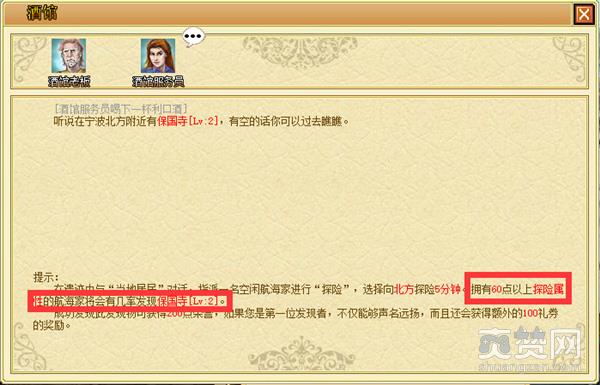 只要你请服务员喝一杯,多数情况下都可以得到有用的探险信息。不过要注意的是,你要先看一下自己手下的航海家是否满足探险的基本条件,不然探险的结果多是失败的。如果有满足条件的探险家,那你尽可以将他派出去探险。