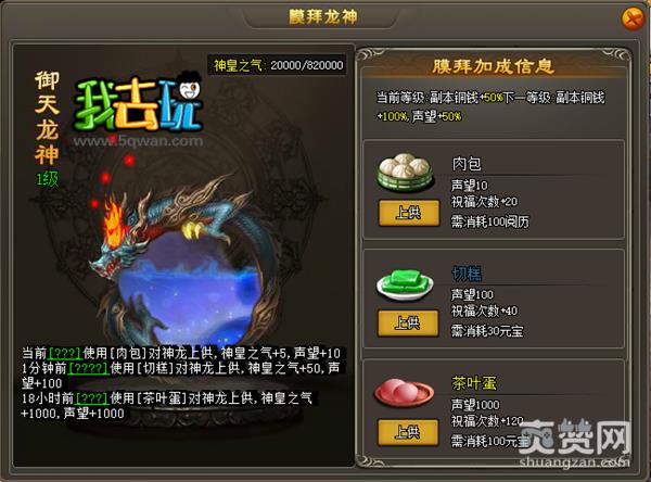 玩家每天只能膜拜龙神1次,每次上供之后可得到一定的声望和增加祝福次数。声望的数量由供品的品质决定,供品品质越高,玩家得到的声望值越大。在膜拜龙神中,玩家最多可增加120次的祝福次数。