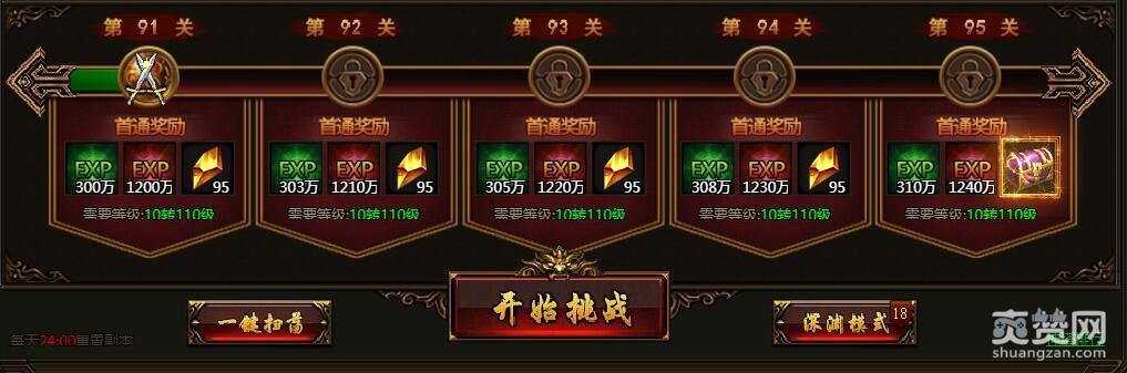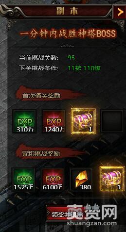 第95关:角色经验*310万,英雄经验*1240万,5级首通神宝箱*1。首通可获,之后变秘宝粉尘*38。