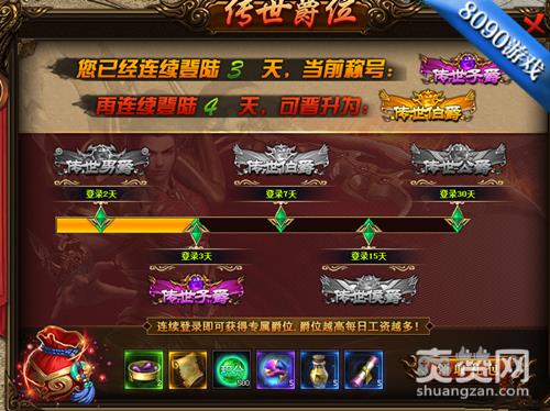 在8090《传奇世界》中,称号系统可是一个非常有趣的玩法。不同的称号代表不同的身份地位,自然在游戏中享有的特权也就不同。不用怕,上8090《传奇世界》,连续累积登录就可以轻松承袭爵位获取称号,享受一回贵族VIP 的待遇,是不是很爽呢?快来和小编一起看看吧。