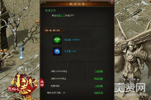 玩家在领取桃源任务奖励的时候,可花费50万或100万金币,领取两倍或三倍的奖励。9377小志传奇桃源任务奖励,主要有一些经验值、书灵值奖励。