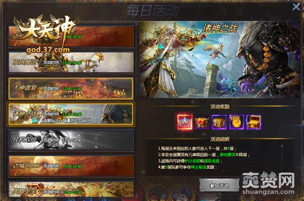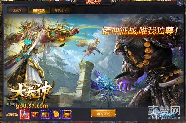 在37《大天神》中,当玩家在诸神之战系统的每一层击杀相应人数后,即可进入下一层,该玩法共分为9层,击碎神秘守卫也会增加击杀人数,其中,安全层为1-5层,死亡复活不降层,而在非安全层死亡则有几率降回一层,原地复活不降层。