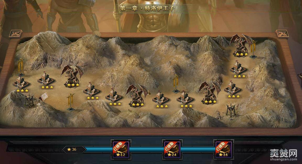 第一章的关卡共有12个关卡,领取达到12星、24星或者36星时分别能领取奖励:80征兵令、20灵魂石、88元宝。