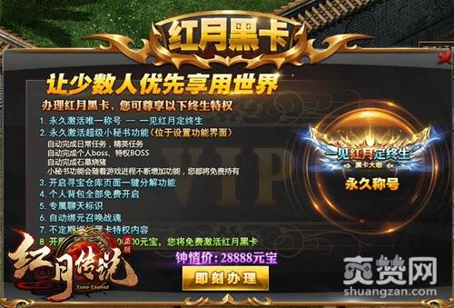 想要开启红月黑卡特权需要28888元宝,但是在开服第一天只要土豪们充值100000元宝就可以免费获得,相信这100000元宝对于土豪们来说算是九牛一毛啦!