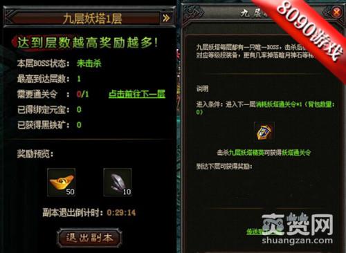 九层妖塔九层妖塔,那自然一共有九层等着我们一一去探索啦。在活动期间,每层妖塔都会刷新一只BOSS。击杀BOSS和精英怪,获得通关所需的通关令方可进入下一层进行挑战。需要注意的是,在活动中,BOSS有极高的几率装备高级装备,还有可能有绑定元宝和黑铁矿等稀有道具掉落哦。
