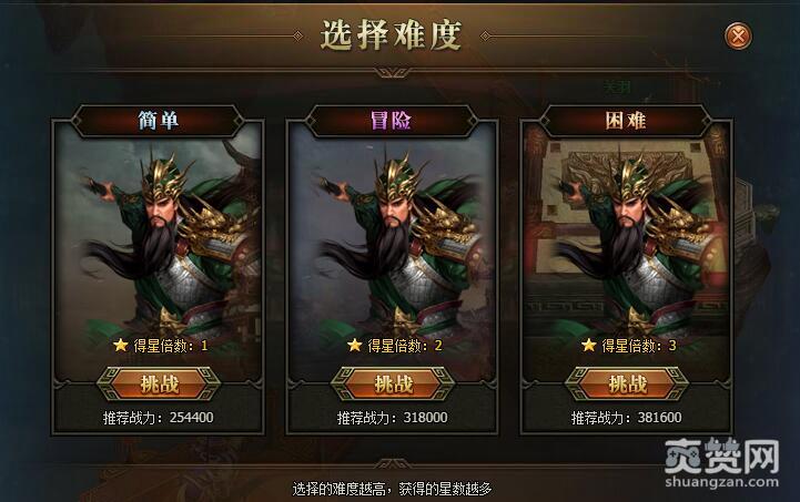 第49关对手是关羽。简单模式下推荐战力254400,可得1颗星;冒险模式下推荐战力318000,可得2颗星;困难模式下推荐战力381600,可得3颗星。