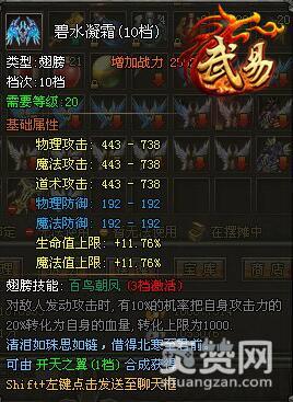 923yx《武易》中翅膀的共分为10档,高档翅膀可以通过低级翅膀合成。当翅膀达到3档后,还可激活“百鸟朝凤”翅膀技能,对敌人发动攻击时,有10%的几率把自身攻击力的20%转化为自身血量,转化上限为1000。此外,翅膀还有7条基础属性,分别是物理攻击、魔法攻击、道术攻击、物理防御、魔法防御、生命值上限与魔法值上限。