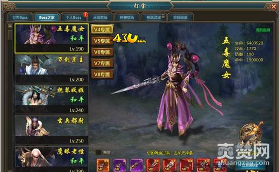 第二种是boss之家,Boss之家中的Boss可以无限挑战,Boss等级越高掉落的物品道具越好。第三种是个人boss,只有VIP4以上的玩家才能够挑战,每天有3次机会,到达对应的个人Boss等级后即可击杀对应的个人Boss。