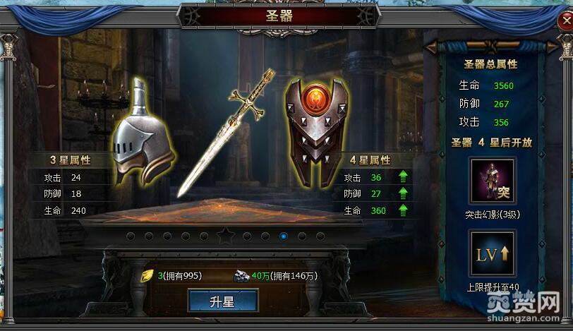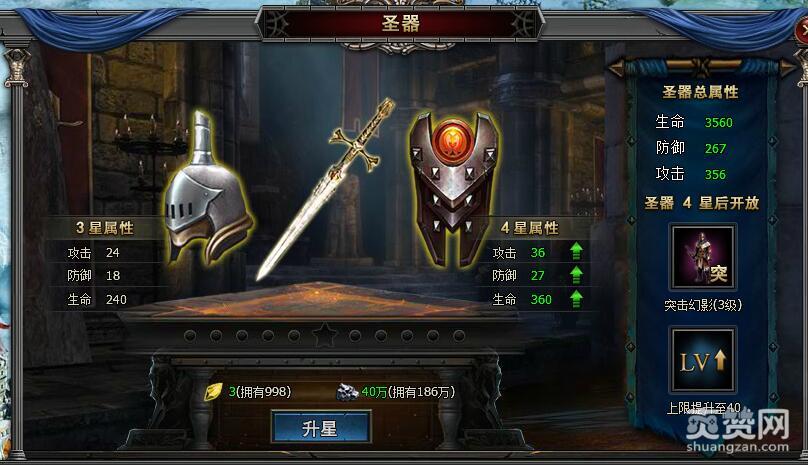 每次升星需要消耗3块圣器精华,40万的铁矿。