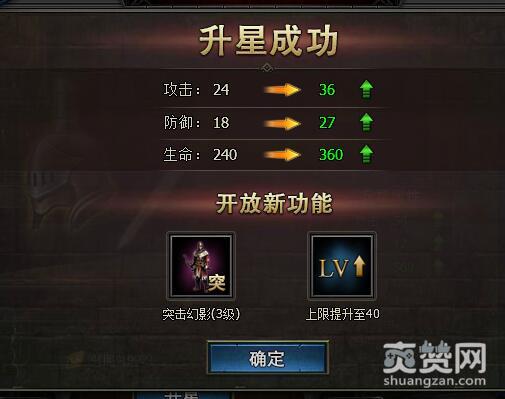 第二次小编便升星成功了。攻击24变36,提升了12;防御18变27,提升了9;生命240变360,提升了120。同时开放新功能:突击幻影(3级),上限也提升至40。