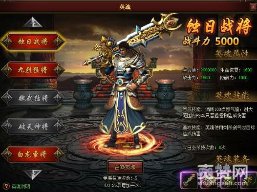 923yx《天神战BT》中的英魂分为五个等级,分别是蚀日战将、九烈猛将、魏武猛将、破天神将和白龙圣将,级越高的英魂拥有更强的防御能力与更高的攻击属性。大家每日上线可以免费获得一次召唤英魂的次数,每在线30分钟也可获得一次召唤次数。