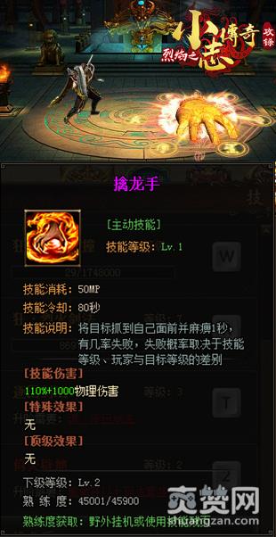 擒龙手:将目标抓到自己面前并麻痹1秒,有几率失败,失败概率取决于技能等级、玩家与目标等级的差别;可造成大量物理伤害;