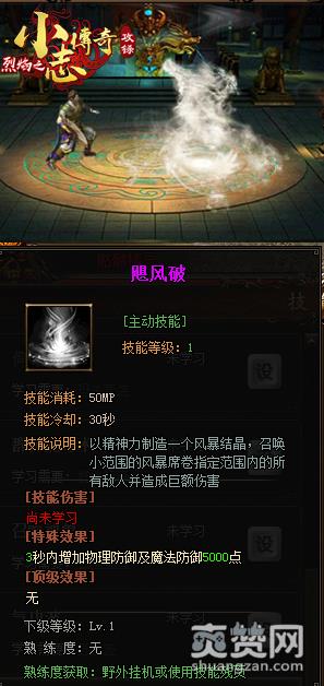 飙风破:以精神力制造一个风暴结晶,召唤小范围的风暴席卷指定范围内的所有敌人并造成巨额伤害,拥有“3秒内增加物理防御及魔法防御5000点”的特殊效果。