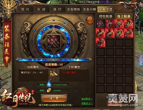 玩家点击主界面下方的“锻造”图标,进入到锻造系统后,选择“装备注灵”即可进入到注灵界面。玩家可以对武器、头盔、衣服、项链、左手镯、右手镯、左戒指、右戒指、腰带、靴子进行装备注灵。注灵的最高等级为15级,需要注意的是,装备注灵是强化装备而不是装备部位,所以要是装备被爆的话,注灵也就没有了,这个和装备强化是不同的!