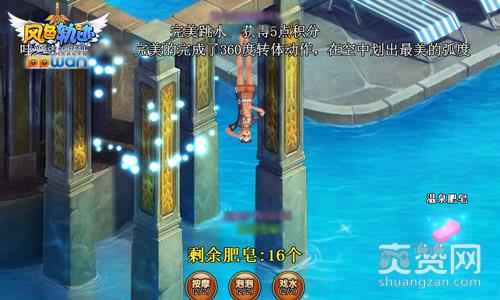 在ppwan《风色轨迹》假日温泉之中,系统每隔几分钟还会刷新大量的肥皂,玩家在场景中拾取两块肥皂即可获得跳水的机会。跳水根据难度系数的不同分为4个等级,红色5分,紫色3分,蓝色2分,绿色(不选)1分,跳水积分排名前5名可以获得排名奖励哦!你是那空中划出最美弧度的跳水冠军吗?