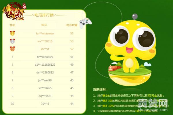 最后当然要评出吃瓜最多的吃瓜群众,送出我们的大礼啦!前十名分别有5万、3万和1万元宝奖励入账,既能吃瓜,又能挣元宝,一举两得啊!