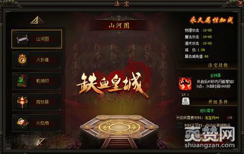 当然,全新法宝还是很有节操滴,并不是你想要就有的!当角色等级达到3转就可以开启法宝入口升级法宝可获得强大的属性加成,等级越高,属性加成越多,我仿佛已经看到自己走上人生巅峰的样子了,哈哈哈!不经一番彻骨寒,怎得梅花扑鼻香;同样升级法宝也是需要有所付出的,每升级一阶法宝就需要消耗相应数量的法宝丹,法宝丹最简单的方式当然是通过商城购买,也可以通过地图野外BOSS、转生地图BOSS、活动获得‘法宝激活后可获得法宝技能金钟罩,使用金钟罩可在一定时间内提高闪避,法宝等级越高,获得的闪避也就越高,技能的冷却时间就越短。
