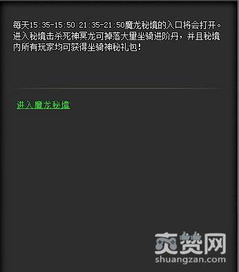 923yx《战天》中的魔龙秘境,在每天的15:35-15:50以及21:35-21:50时间段开启。想要前往的勇士,可以通过左边弹出的提示框,点击传送找到活动NPC,对话前往。进入活动地图后,里面将会刷新出大量的精英怪和BOSS死神冥龙。