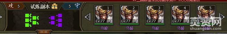 我们试着挑战一下困难难度的马超,进入战场,战场地形是城池,对手是5个马超77级。