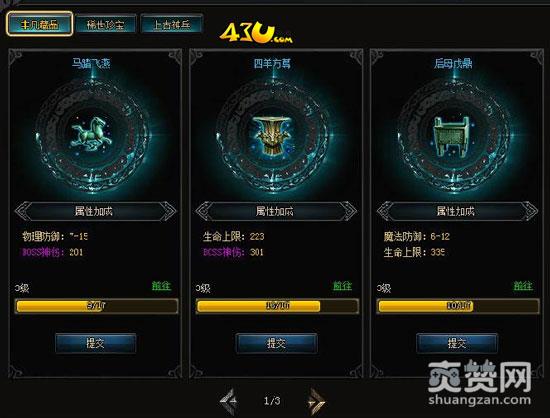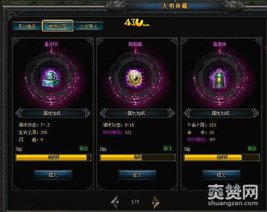 43u《大明征途》中的大明典藏根据品质分为三类,即非凡藏品(蓝)、稀世珍宝(紫)、上古神兵(橙),每类分9种,每种可以收集进行升级,等级越高需要的数量越多。激活和升级藏品都可以获得属性加成,种类不一样加点属性也不一样哦!