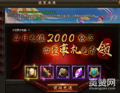 活动期间内,每日充值达指定钻石数额,即可领取充值奖励,可原每日充值奖励叠加领取。有两档奖励可领取:2000钻石、20000钻石。每档都有丰厚豪礼免费领取。